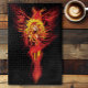 Mulher que é uma chama com asas. Uma fênix em chamas vermelha, laranja e amarela num pano de fundo preto
