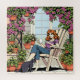 Uma ilustração divertida de um gibi de uma mulher sentada na cadeira de grama em seu pátio, com seu gato, uma xícara de café ou chá e cercada por clematis roxos e plantas penduradas.