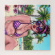 Uma bonito moça de pop em um biquíni de bolinhas roxa, óculos de sol e bandana na praia em um estilo de gibi tropical.