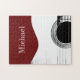 Quebra-cabeça com guitarra preta e branca. Definida em um fundo vermelho, a tipografia branca pode ser personalizada com seu próprio texto. Um presente desafiador para o guitarrista na sua vida!