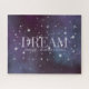 Quebra-cabeça com as palavras inspiradoras "sonhar, imaginar, acreditar, criar" em letras maiúsculas violetas pastéis contra um céu noturno estrelado em meio a violeta empoeirada e nuvens espaciais da nebulosa azul. Mística e mágica como o misterioso reino dos sonhos. Use o modelo de texto para adicionar um nome, fortalecendo palavras ou aspas inspiradoras. ♡ Idyllfire
