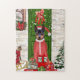 O Natal do Cachorro Miniatura, sentado do lado de fora da casa decorada com coroa de Natal, a árvore de Natal é uma ideia perfeita de presente de Natal para amantes de cachorros.