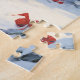 Design de um cão da Terra Nova vestindo um chapéu de Santa andando pelas montanhas de neve e desejando um feliz natal.