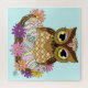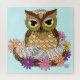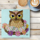 Coruja-Páscoa-marrom-branca sentada num ninho de ovos de páscoa pastel e flores num pano de fundo azul-claro