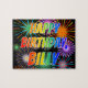 Este animador e animado design de quebra-cabeça de quebra-cabeça com tema de aniversário mostra a mensagem "FELIZ ANIVERSÁRIO, BILLY" tendo um espectro colorido de arco-íris inspirado em um padrão de gradiente inspirado, e um vibrante e explosivo fogos de artifício celebratório inspiraram um padrão de fundo. Um quebra-cabeça vibrante como este pode ser uma maneira divertida de reconhecer o aniversário de alguém chamado Billy. [~Z0000465]
