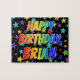 Este animador, animado, design de quebra-cabeça de quebra-cabeça com tema de aniversário tem a mensagem "FELIZ ANIVERSÁRIO, BRIAN" com os personagens que têm um espectro colorido de arco-íris inspirado em um padrão de gradação, junto com uma estrela divertida forma o plano de fundo. Um quebra-cabeça excitante como este pode ser usado para enviar desejos de aniversário a alguém chamado Brian. [~Z0000468]