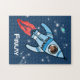Teste as habilidades dos seus filhos de quebra-cabeça com esta explosão pessoal do espaço de foguetes rapazes quebra-cabeça de quebra-cabeça azul. Jigsee ilustrado e design por Sarah Trett.