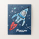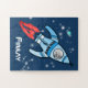 Teste as habilidades de quebra-cabeça do seu filho com esta explosão pessoal do espaço para foguetes rapazes quebra-cabeça de quebra-cabeça azul. Mude a foto na nave espacial para a sua fotografia divertida dos astronautas. Jigsee ilustrado e design por Sarah Trett para www.mylittleeden.com
