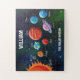 Quebra-cabeça educacional do sistema solar para crianças que são fãs do espaço! Cada estrela ou planeta é rotulado com nome. Inclui sol, mercúrio, veno, terra, marte, jardim, saturno, urano e nepografia em ordem apropriada. Legal fundo colorido de galáxia. Adicione o nome da criança para personalizar!