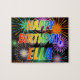 Este vibrante, vivo, design de quebra-cabeça de quebra-cabeça com tema de aniversário tem a mensagem "FELIZ ANIVERSÁRIO, ELLA", tendo um espectro colorido do arco-íris inspirado em um padrão de gradação, e um divertido fogo de artifício comemorativo inspira um padrão de fundo. Uma quebra-cabeça vibrante como esta pode ser uma maneira divertida de enviar cartões de aniversários a alguém chamado Ella. [~Z0000465]