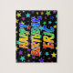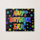 Este animador e animado design de quebra-cabeça de quebra-cabeça com tema de aniversário tem a mensagem "FELIZ BIRTHDAY, ERIC" com os personagens que têm um espectro colorido de arco-íris inspirado num padrão de gradação, juntamente com um padrão de fundo de campo de estrela divertido. Um quebra-cabeça empolgante como este pode ser uma maneira divertida de enviar desejos de aniversário a alguém chamado Eric. [~Z0000468]