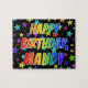 Este design de quebra-cabeça de jigsaw emocionante, divertido, com tema de aniversário apresenta a mensagem "FELIZ ANIVERSÁRIO, MANDY" com os personagens que têm um padrão de gradiente inspirado no espectro de arco-íris, juntamente com um padrão de fundo de campo de estrela vibrante. Um quebra-cabeça excitante como este pode ser usado para enviar cartões de aniversários para alguém chamado Mandy. [~Z0000468]
