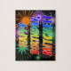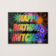 Este vibrante e empolgante design de quebra-cabeça de aniversários com tema de aniversário exibe a mensagem "FELIZ ANIVERSÁRIO, MITCHELL", tendo um padrão de gradiente inspirado no espectro do arco-íris colorido, e um divertido e explosivo padrão de fundo inspirado em fogos de artifício celebratórios. Um quebra-cabeça vibrante como este pode ser usado para enviar desejos de aniversário a alguém chamado Mitchell. [~Z0000465]