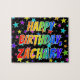 Este design de quebra-cabeça de quebra-cabeça animador e divertido, com o tema de aniversário, mostra a mensagem "HAPPY BIRTHDAY, ZACHARY" com os personagens que têm um espectro colorido de inclinação inspirado no arco-íris, juntamente com um padrão de fundo em forma de estrela viva. Um quebra-cabeça colorido como este pode ser usado para enviar uma mensagem de saudação de aniversário a alguém chamado Zachary. [~Z0000468]