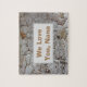 "Nós te amamos, Nana" é o sentimento nesta quebra-cabeça personalizada. O plano de fundo apresenta uma foto de latido de árvore que exibe um padrão de abstrato. A cinza clara do tronco da árvore é pontilhada e girada com pontos ouro castanho e vermelho junto com linhas curvas em cinzas escuras. O centro deste quebra-cabeça rústico é um retângulo de cinza leve que fornece a cor de fundo sólida para "Nós te amamos, Nana" que pode ser facilmente personalizada para atender às suas necessidades.