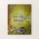 Um filhote de German shepherd bonito e esquilo numa design de arte de cão de uma floresta fantástica, de Susan, com palavras inspiradoras, nunca pára de acreditar.