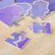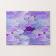 Quebra-cabeça em nuvens estilizadas em gradientes sedosos de roxo violeta mole, aqua e azul pálido, acentuadas com vislumbres de céu roxo profundo. Nas tradições japonesas, as nuvens representam elegância e alto status. No budismo, as nuvens significam o "Paraíso Ocidental" para além da Terra