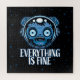 Imagem vetorial de um astronauta zombie com olhos grandes vestindo um capacete espacial com um escudo de vidro rachado em tons de azul com o texto Tudo Está Bem. Etiquetas: astronauta, cosmonauta, capacete, zombie, espaço, astrônomo, monstro, cadete, cadete, morto