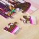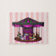 Um carrossel roxo, muito colorido, com feliz-de-volta, bonito, completo com cavalos decorados de madeira de todas as cores e designs que realmente acrescentam um toque de carnaval ou de circo.