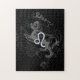 Um cromo de prata como o sinal do zodíaco de Leo em um vintage Hevelius cerca do impressão 1690 do mapa da constelação da astrologia no fundo preto. Uma mistura de atrevido urbano moderno e de vintage projeta para uma grande ideia feita sob encomenda do presente de aniversário.