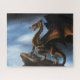 Dragão na borda de um penhasco, céu azul, montanhas.