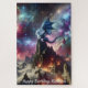 Uma imagem fabulosa de fantasia de um dragão azul-prateado num pico de montanha, contra uma galáxia de estrelas e nebulosas. Perfeito para quem ama fantasia e dragões. O texto na parte inferior pode ser removido ou deixado em um presente de aniversário.