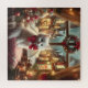 Gato branco com arco vermelho, posando perto da janela de uma casa entre as decorações de Natal. Ao fundo, uma rua da vila de Natal, perto de uma neve cai à noite.