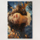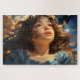 Uma jovem cabeleira vestindo um topo azul claro e um colar de ouro se parece com um sonho quando o vento sopra pelo cabelo. Um céu azul escuro com nuvens brancas e laranja sentam atrás dela. Este é o momento que muda tudo.
