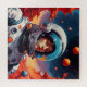 Um astronauta solitário está sobre uma paisagem de alienígena rochosa, mirando em uma enorme estrutura robótica com uma cúpula clara e pernas mecânicas. Vários planetas são visíveis no céu, criando uma cena marcante de exploração espacial.