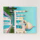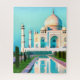 Quebra-cabeça em uma ilustração do Taj Mahal, refletida em uma piscina, sob um aquamarine azul céu amanhecer