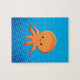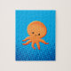 Um polvo de desenho laranja giro. Fundo azul. Quebra-cabeça de serra de bebê. Ideia de presente para crianças.