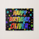 Esta design de quebra-cabeça de jigserra divertida, excitante e com tema de aniversário exibe a mensagem "HAPPY BIRTHDAY, OLIVER" com os personagens que têm um espectro colorido de arco-íris inspirado em um padrão de gradação, junto com um padrão de fundo de estrelas vibrante. Uma quebra-cabeça colorida como esta pode ser uma maneira divertida de enviar desejos de aniversário a alguém chamado Oliver. [~Z0000468]