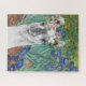 A quebra-cabeça de um belo e artístico quebra-cabeça apresenta a pintura de arte Irisa de Vincent Van Gogh como pano de fundo para uma adorável lhama de aquarela com uma coroa rico de flores.