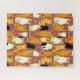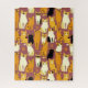 Quebra-cabeça num padrão lúdico de gatos estilizados em tons quentes de gengibre, creme, preto e marrom sobre um fundo marrom caramelo. Cada gato tem sua própria expressão e marcas bonitinhas, com pequenas pegadas espalhadas por toda parte.