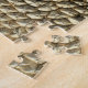 Sementes de uma cabeça seca de girassol em colagem e colocadas num padrão caleidoscópico. As sementes escuras irradiam para fora para sementes mais leves.