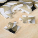 Este divertido quebra-cabeça de voleibol feminino apresenta um padrão de vários tamanhos de ouro mudado, bronze e volichões brancos virados de cada lado sobre fundo preto - os painéis não-brancos são coloridos com um gradiente de bronze claro a escuro acentuado com um padrão artístico, feminino, floral - personalizado com o nome e número de camisa do voleibol - por katz_d_zynes