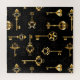 Padrão perfeito de chaves antigas, douradas e silhuetas em fundo preto.
