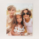 Jig viu quebra-cabeça apresentando sua foto personalizada e o texto "Pai, nós te amamos" e pequenos corações brancos.