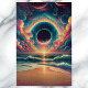Essa imagem cativante dá à majestade do cosmos a serenidade de uma paisagem terrestre. No horizonte, uma explosão solar radiante perfura um misterioso portal, cercado por uma espiral hipnótica de energia luminosa. Acima, desdobra-se uma vasta extensão de espaço, pontilhada com corpos celestes — planetas, luas e nebulosas — todos banhados num espectro vibrante de cores que vão de púrpuras profundas a laranjas e vermelhos de fibra. O céu aparece vivo, girando com nuvens que imitam as formas e as tonalidades de galáxias distantes. Abaixo, a tela cósmica é espelhada em ondas ondulantes que caem em uma costa serena, criando uma mistura harmoniosa de céu e mar, sonho e realidade. A trabalho de arte transforma a vastidão do universo em uma ponte perfeita com a beleza familiar do nosso mundo, evocando admiração e admiração.