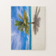 Esta foto caracteriza uma palmeira que está apenas em um Sandy Beach branco.