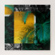quebra-cabeça de quebra-cabeça quadrada desafiante para adultos apresenta quadrados amarelos rústicos de ouro aninhados em um padrão tropical de cinza com grandes folhas verdes de palmeira sobre ele.