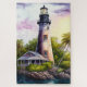 Quebra-cabeça com a bela pintura de um farol sentado numa ilha tropical com palmeiras.
