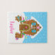 Essa quebra-cabeça fofa e festiva pode ser personalizada com um nome. Ele tem uma casa de pão de gengibre fofa decorada com doce rosa e verde. Além disso, são adoráveis gengibres com presentes, vestidos com chapéus de Papai Noel e cachecol. Ao fundo está um céu azul brilhante de inverno com flocos de neve em queda elegante. Isto é perfeito para o Natal e o feriado de inverno.
