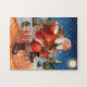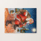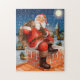 Um Papai Noel alegre sentado em um telhado de neve, com um dedo divertido para seus lábios como se dissesse "shh". Observe os destaques os detalhes complexos de seu terno vermelho e as luzes cintilantes da vila abaixo. A cena é iluminada por uma lua brilhante, criando um ambiente festivo quente.