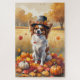 Uma pintura em forma de aquarela de um cão alegre sentado em meio a uma pilha de folhas vibrantes de queda, cercado por pequenas abóboras e bolotas espalhadas. O cachorro veste um chapéu de peregrino e fede de alegria, capturando o espírito da Ação de Graças. No fundo, campos de colheita suaves e árvores abrigadas em ouro criam um ambiente rural pacífico. Texturas gentis e tons de outono aquecidos dão à cena uma sensação acolhedora e nostálgica de celebrar a beleza da estação.