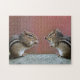 Assento dois pequeno em uma rocha. Se está comendo uma bolota e o outro está lavando sua cara.