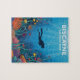 Um mergulhador natação através de um coral colorido, recheado de peixes tropicais e iluminado por raios solares filtrando de cima.