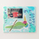 Engraçado Papagaio Desenhando Foto Crianças de Aniversário quebra-cabeça. Papagaio engraçado com sorvete no bico. O papagaio está num fundo abstrato azul e verde. Adicione sua foto e personalize com seu nome e sua idade. Bonito presente de aniversário para crianças.