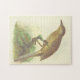 Esta quebra-cabeça de aparência vintage apresenta uma representação de um pássaro empoleirado em um galho.