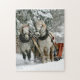 Um quebra-cabeça bonito que descreve uma cena do inverno de um passeio do trenó. O trenó é puxado por dois cavalos fortes. Um quebra-cabeça do divertimento a unir especialmente para aqueles que como imagens da neve. s